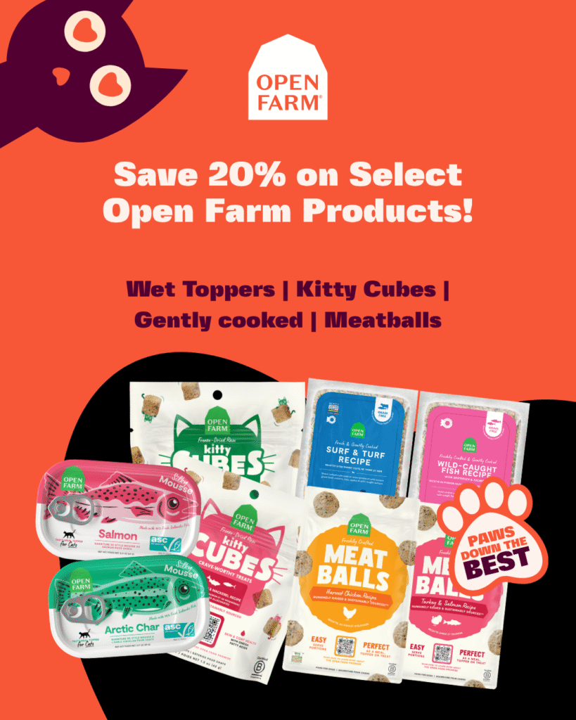 Save 20% on Open Farm’s wet toppers, kitty cubes, gently cooked meals, and meatballs. From rich flavours to hearty textures, these high-quality meals make every bite a little more special.