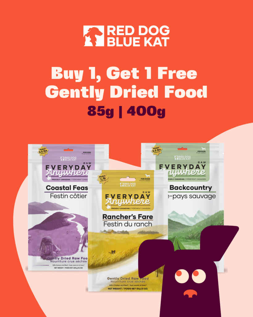 Snatch up this amazing Buy One, Get One offer on Red Dog Blue Kat’s gently dried raw food! Available in 85g and 400g sizes, these Canadian-made formulas are a convenient way to give your pet the benefits of raw nutrition.