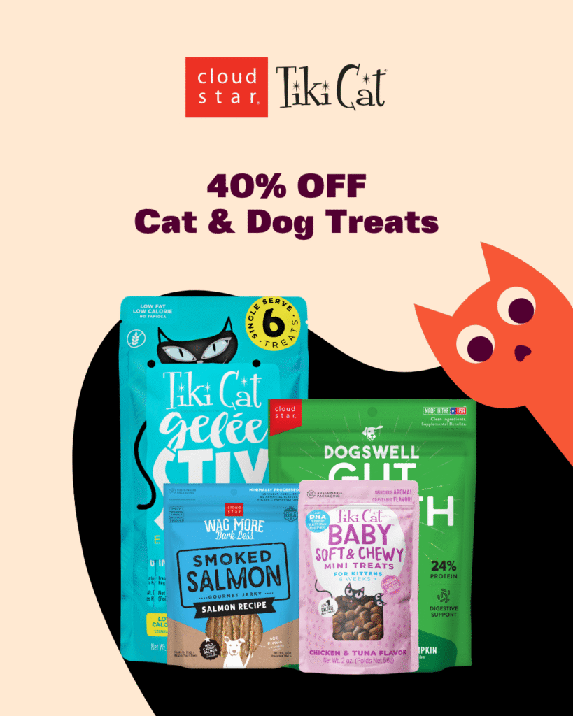 Treats are moments of connection. Save 40% on Cloud Star and Tiki Cat treats, from training bites to creamy mousse cats love. Quality ingredients without artificial preservatives, whether you’re teaching tricks or showing love.