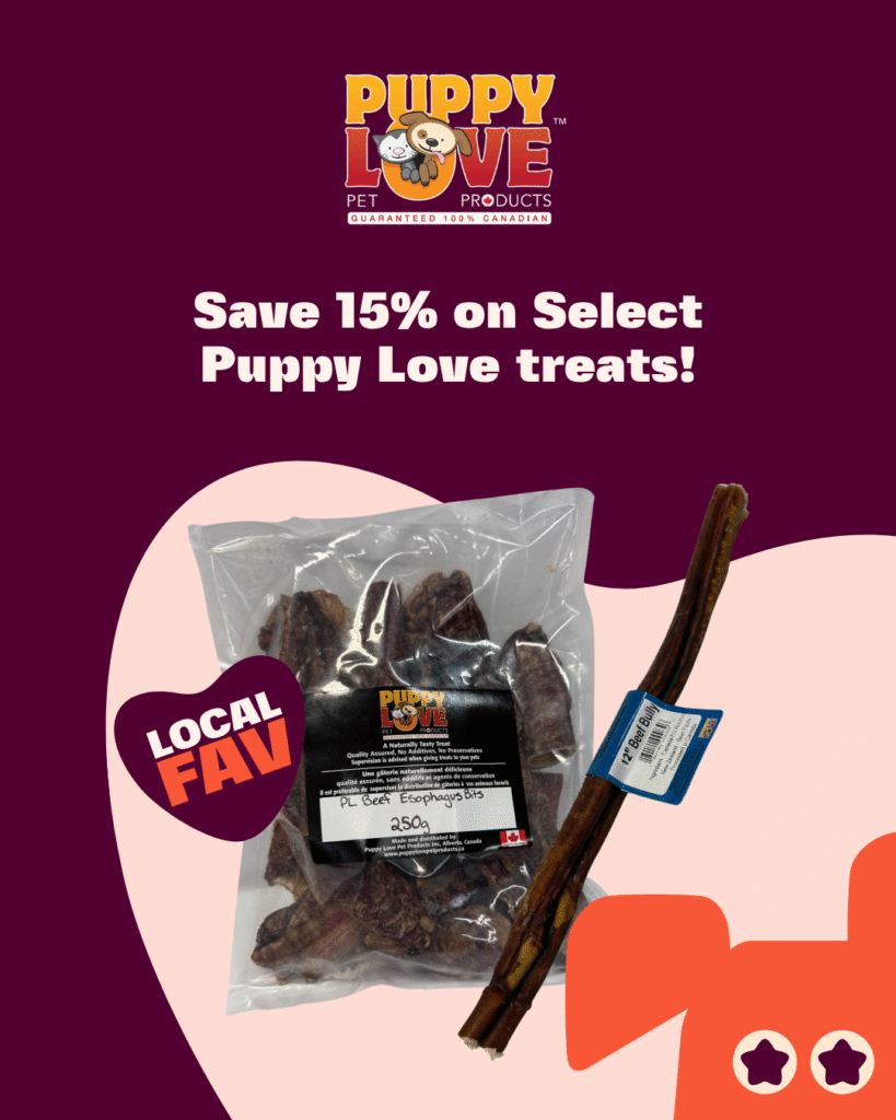 Save 15% on select Puppy Love treats, including unique favorites like beef esophagus bits. These 100% Canadian Brand features quality assurance and without any additives, preservatives, or chemicals – just wholesome nutrition your dog will love.