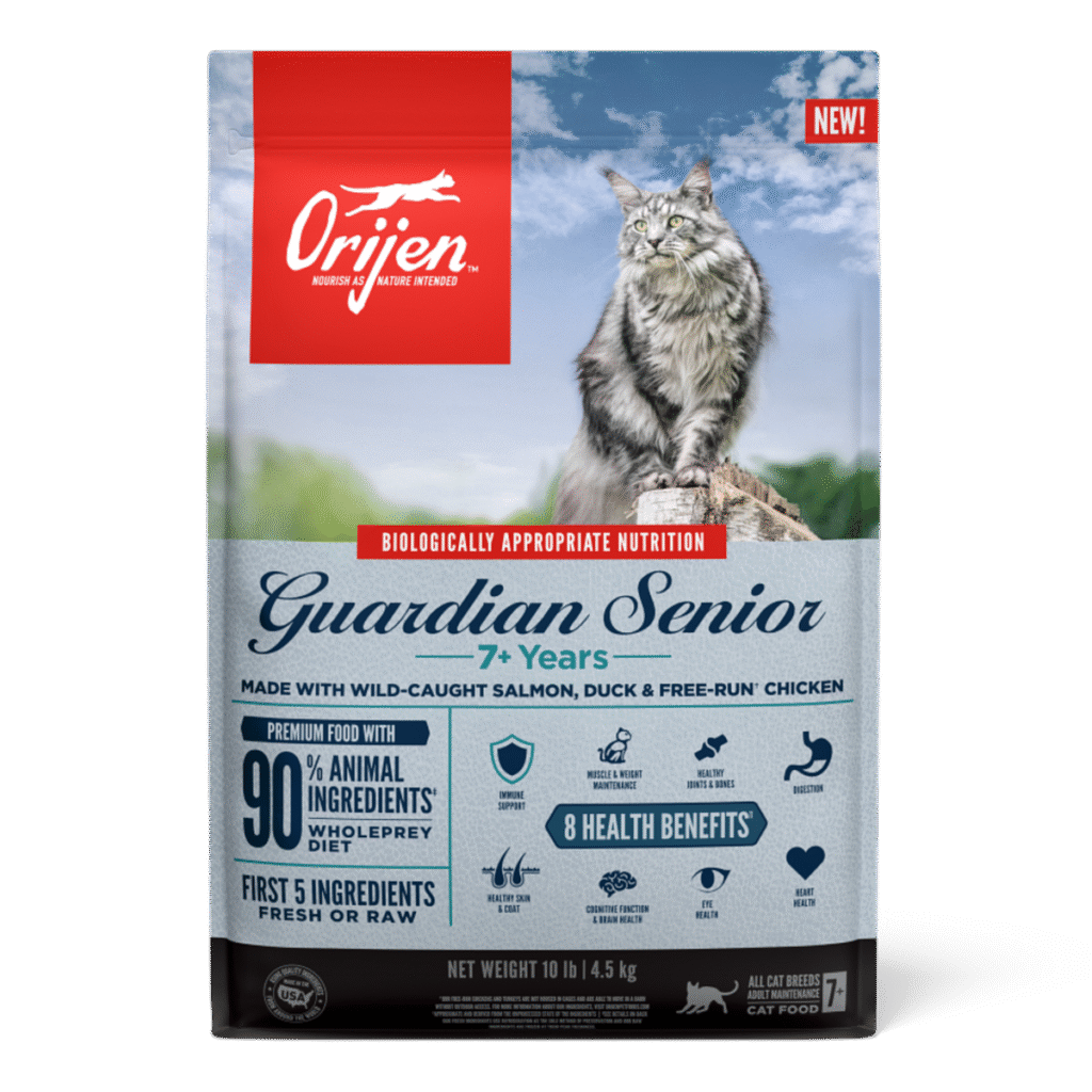 Orijen Senior Cat Food offers protein-rich nutrition with omega-3s from wild-caught fish to support brain function and joint health.
